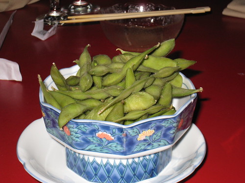 Being one not inclined to order sushi, I was relieved to see some non-seafood items on the menu, including udon soup and cooked meats. The bento box was rather expensive in my opinion ($23.95), so I opted for Teriyaki chicken ($8.95), Edamame beans ($4.95), and a side of rice ($1.75) instead. The waitress did her best to keep the orders of over ten people straight, and I must say, did a decent job. Working with the constraint of only being able to speak comfortably to those seated at the ends of the table must be frustrating.